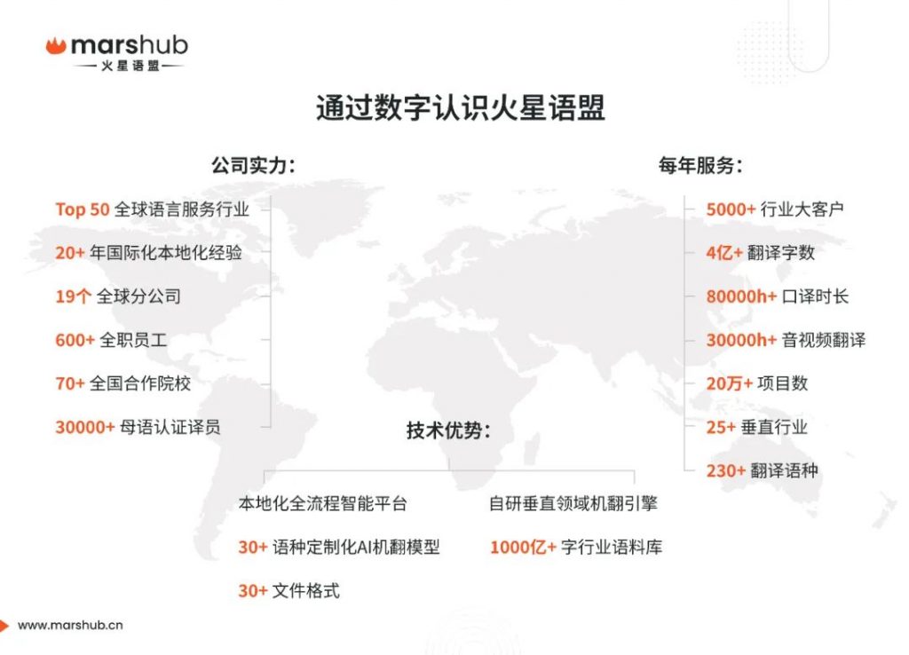 作為全球領(lǐng)先的數(shù)智化語(yǔ)言服務(wù)與技術(shù)解決方案提供商,火星語(yǔ)盟位列全球語(yǔ)言服務(wù)商第33名、亞太區(qū)第8名,穩(wěn)居國(guó)內(nèi)翻譯行業(yè)第一梯隊(duì),年交付口筆譯項(xiàng)目20萬(wàn)個(gè),年翻譯字?jǐn)?shù)超5億,覆蓋了英語(yǔ)、俄語(yǔ)、日語(yǔ)、法語(yǔ)、德語(yǔ)、西班牙語(yǔ)、葡萄牙語(yǔ)等230+語(yǔ)種,累計(jì)為全球5000多家中大型行業(yè)客戶提供多快好省的翻譯服務(wù),持續(xù)賦能國(guó)際工程、醫(yī)療健康、制造業(yè)、大文娛、法律、財(cái)經(jīng)等領(lǐng)域的全球化戰(zhàn)略落地。
